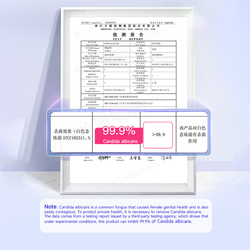 Note: Candida albicans is a common fungus that causes female genital health and is alsoeasily contagious. To protect private health, it is necessary to remove Candida albicans.The data comes from a testing report issued by a third-party testing agency, which shows thatunder experimental conditions, this product can inhibit 99.9% of Candida albicans.